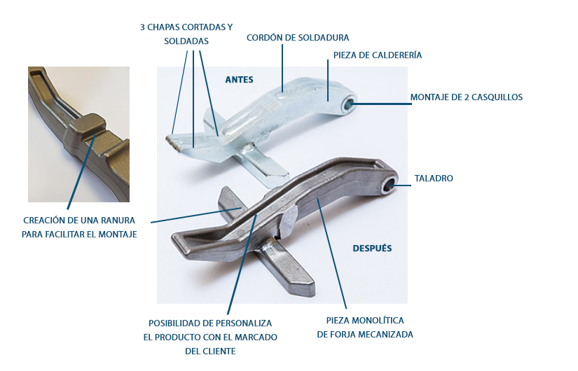 En este ejemplo concreto, hemos transformado una pieza mecanosoldada, fabricada en calderería, en una pieza monolítica forjada y mecanizada. De hecho, en vista del volumen anual, que pasaba de algunas centenas de piezas a varios miles, nuestro cliente nos solicitó un estudio de factibilidad y un presupuesto…